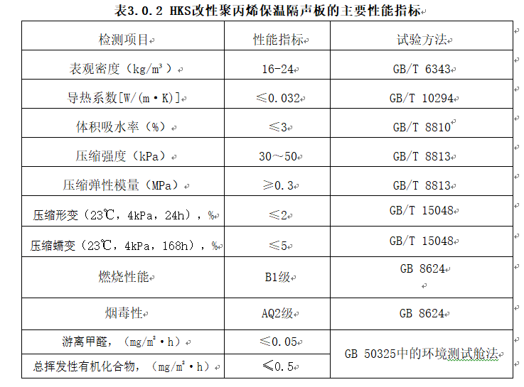HKS改性聚丙烯保溫隔聲板主要性能指標(biāo)